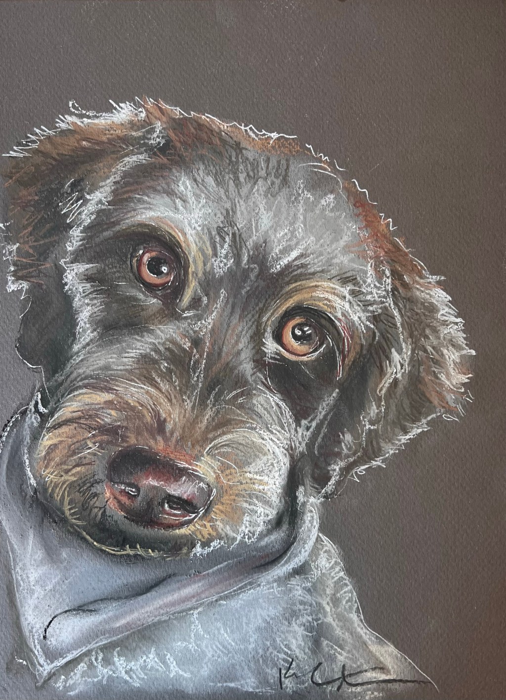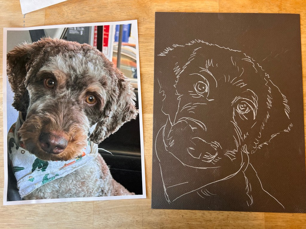 This weekend, I had the absolute joy of painting my first holiday portrait of 2024: the adorable Benning, a charming doodle. For this piece, I opted for a darker paper background to enhance the warmth of the overall color palette. While at first glance Benning’s coat may seem primarily gray, it’s actually a beautiful blend of subtle tones, layered together to bring depth and texture to her portrait. Capturing her sweet, expressive face was such a delight. Merry Christmas, Benning!